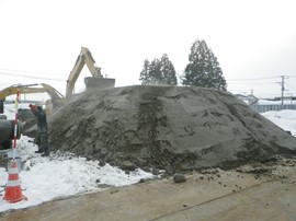 (重機にて混入材攪拌) (今後、埋め戻しに使用予定)